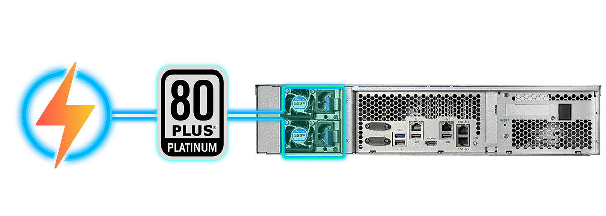 Com fontes de alimentação redundantes certificadas 80 PLUS Platinum, o Lockerstor 10 Gen3 mantém eficiência de até 92%.