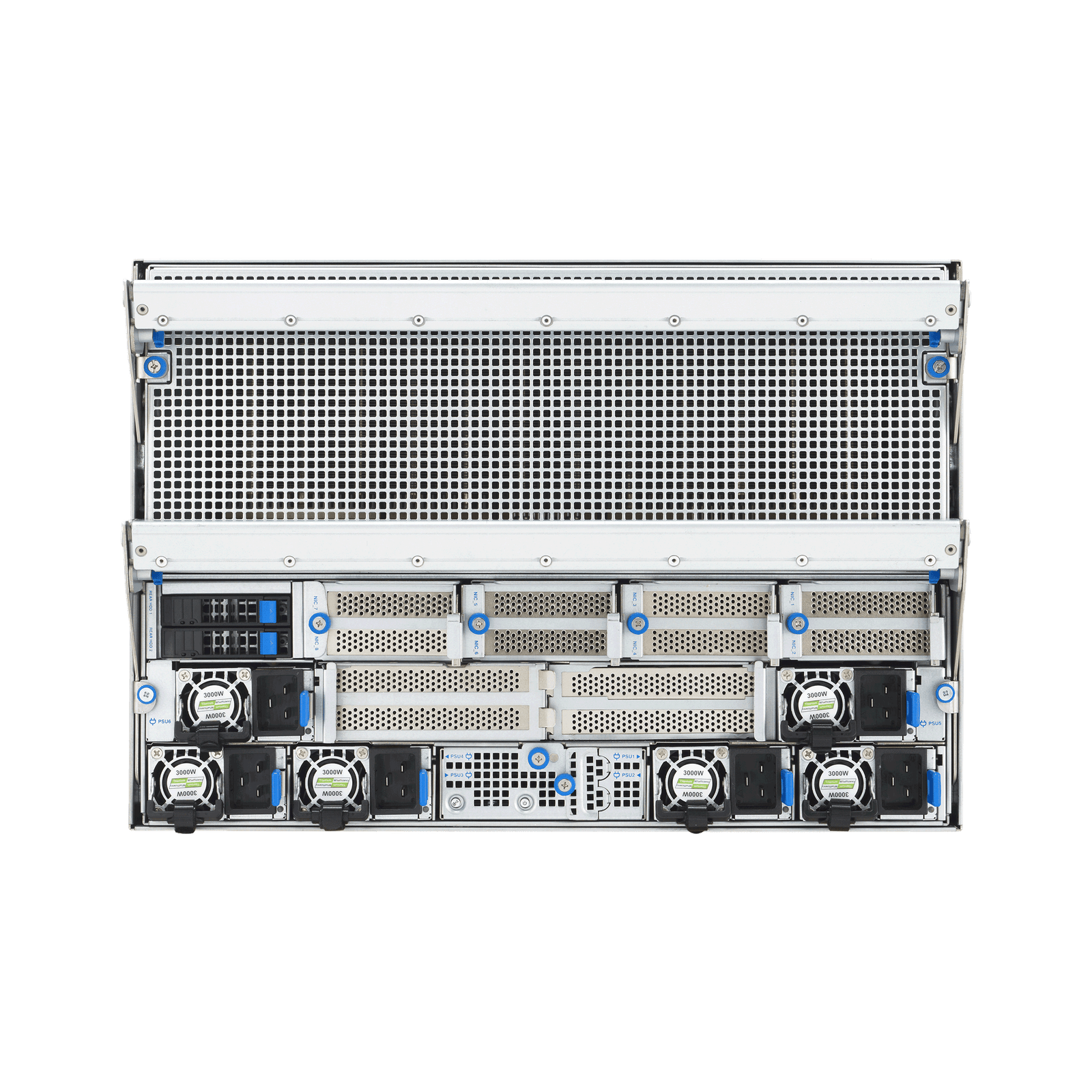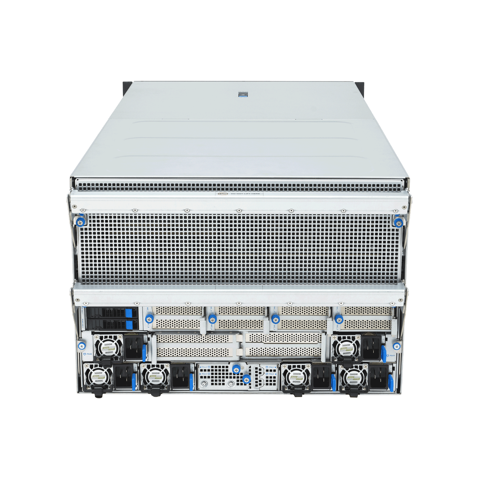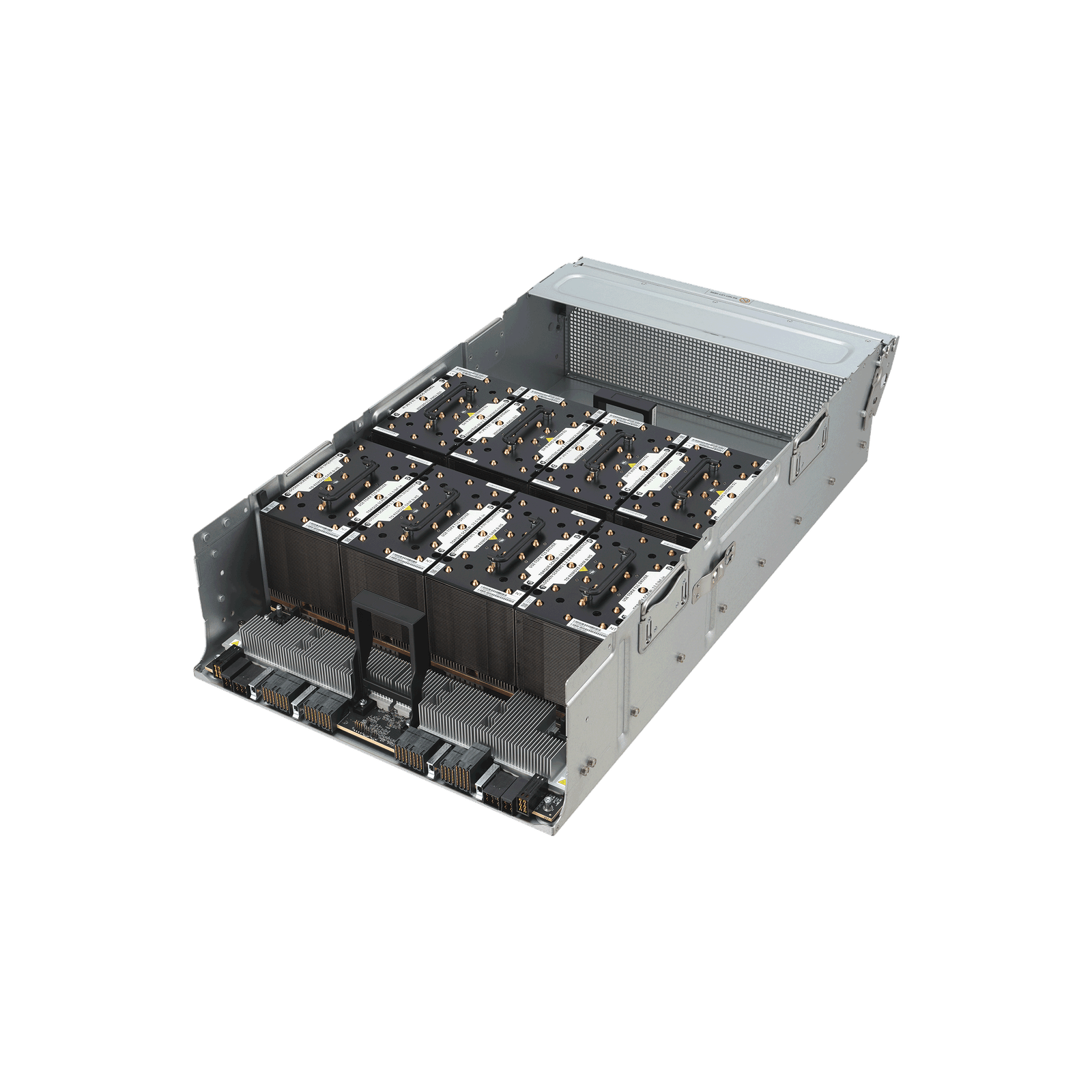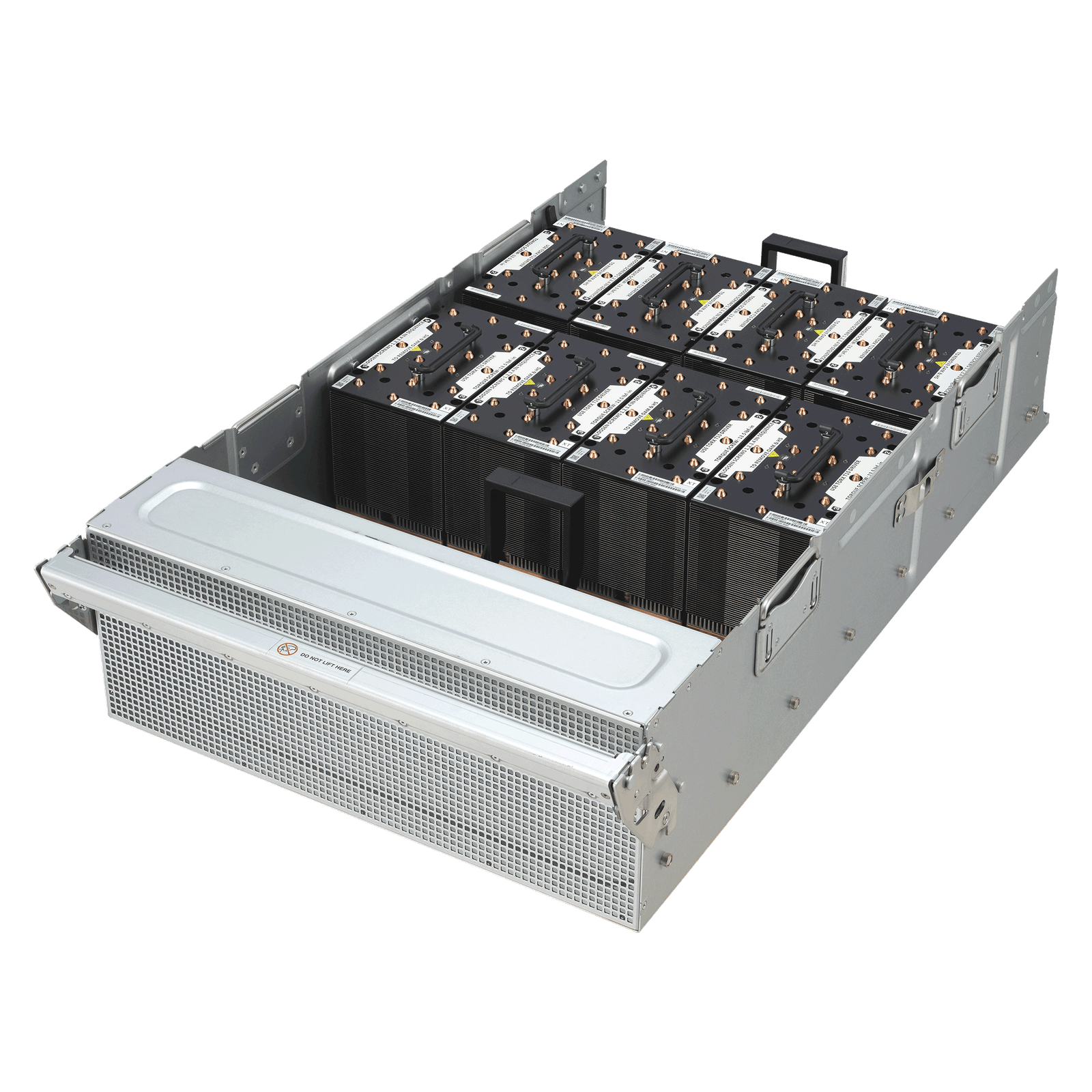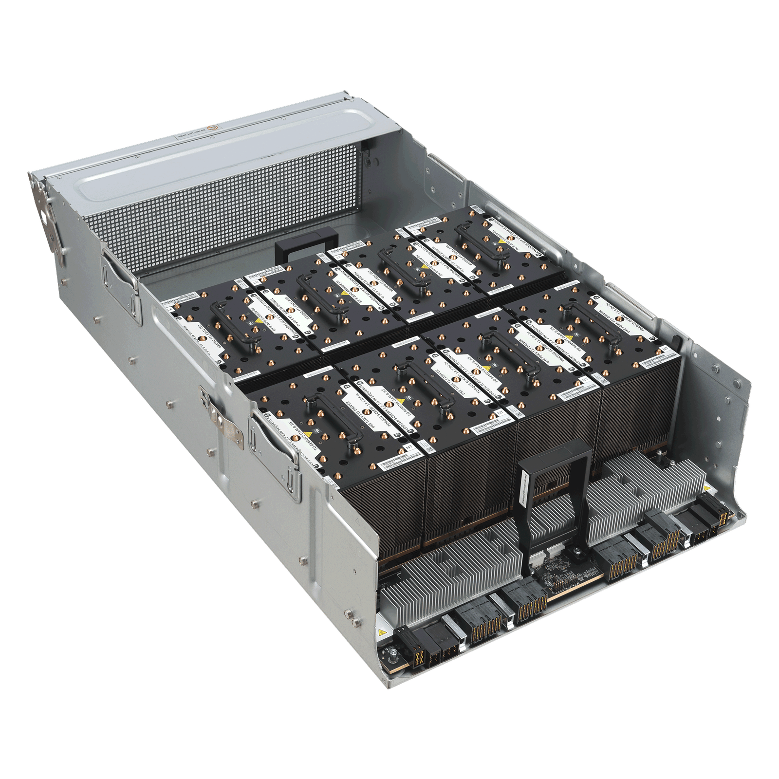 O ASUS ESC A8A-E12U representa o ápice da computação acelerada com GPUs, combinando duas CPUs AMD EPYC™ 9005 e oito GPUs AMD Instinct™ MI325X para oferecer desempenho extremo em ambientes de inteligência artificial generativa, aprendizado profundo e computação de alto desempenho (HPC). Seu design 7U modular maximiza a eficiência térmica, simplifica a manutenção e garante conectividade de ponta com até 11 slots PCIe® Gen5, 24 slots de memória DDR5 e 10 unidades NVMe de alta velocidade.