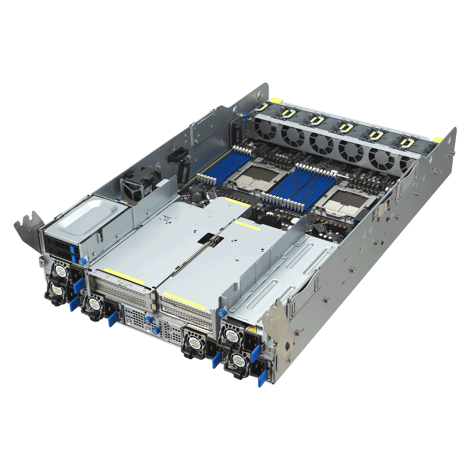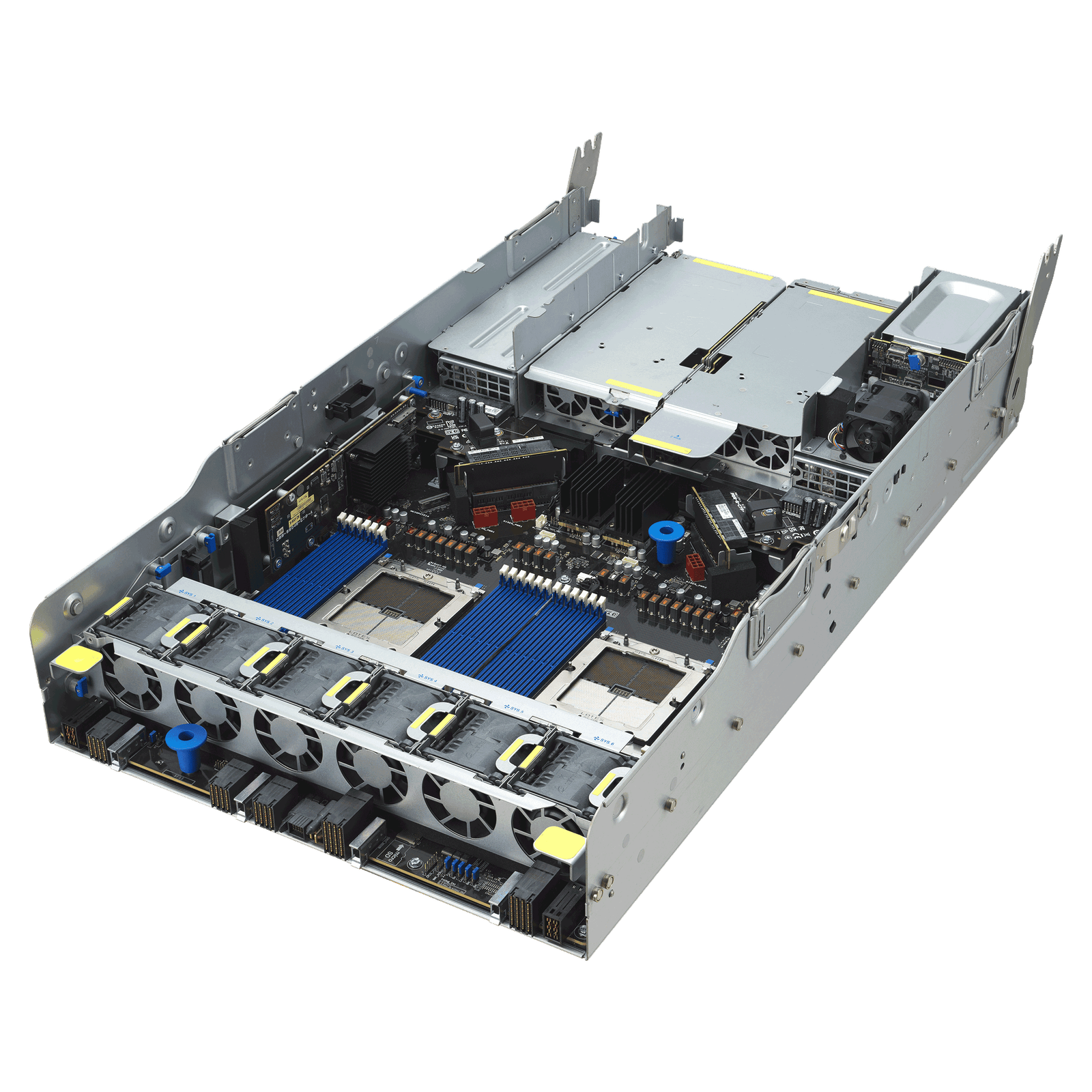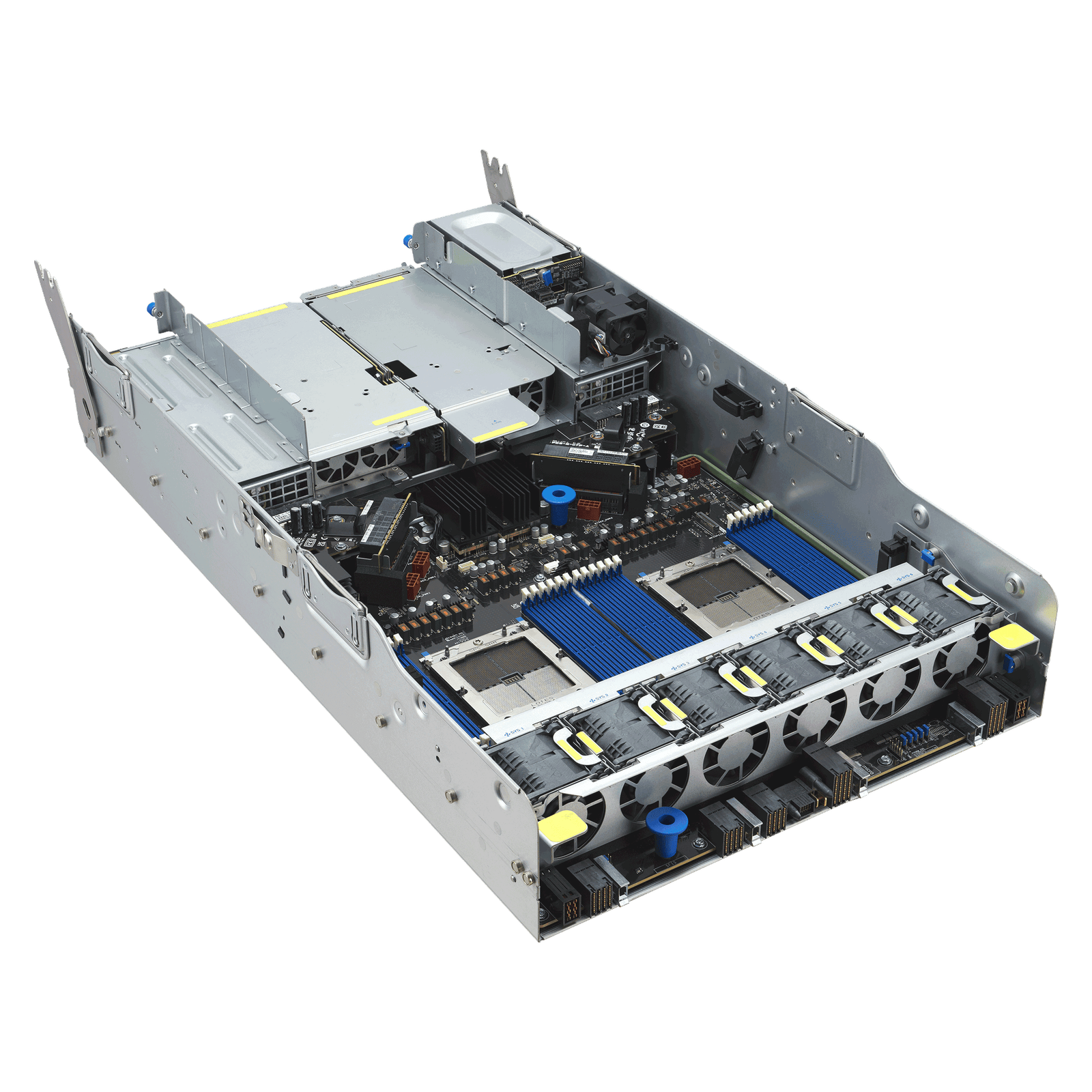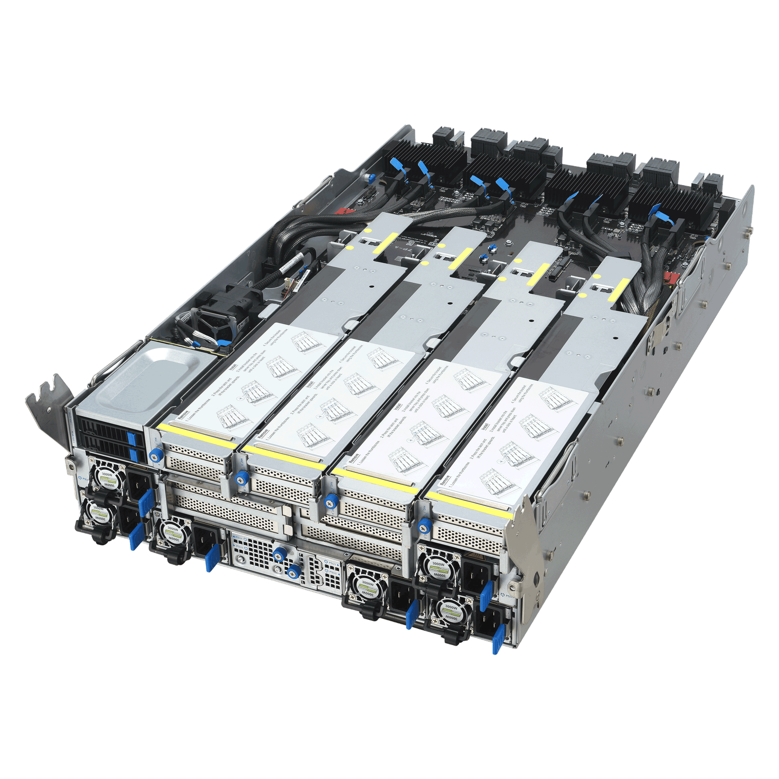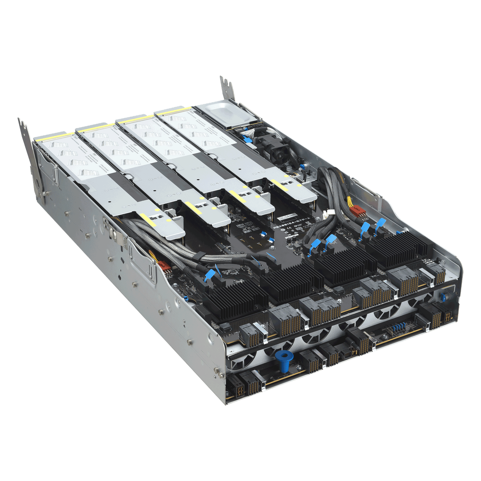 O ASUS ESC A8A-E12U representa o ápice da computação acelerada com GPUs, combinando duas CPUs AMD EPYC™ 9005 e oito GPUs AMD Instinct™ MI325X para oferecer desempenho extremo em ambientes de inteligência artificial generativa, aprendizado profundo e computação de alto desempenho (HPC). Seu design 7U modular maximiza a eficiência térmica, simplifica a manutenção e garante conectividade de ponta com até 11 slots PCIe® Gen5, 24 slots de memória DDR5 e 10 unidades NVMe de alta velocidade.