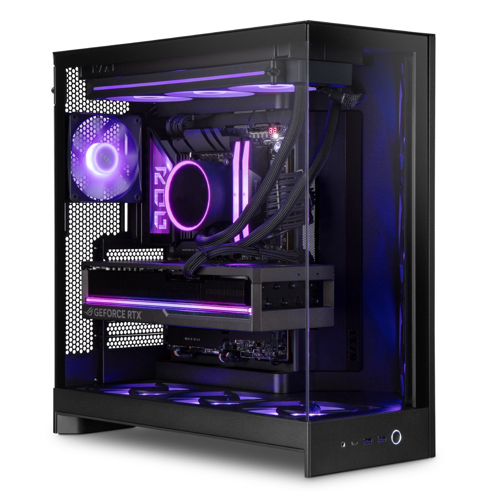 Sistema de refrigeração líquida selado com radiador triplo de 360mm e ventoinhas RGB.