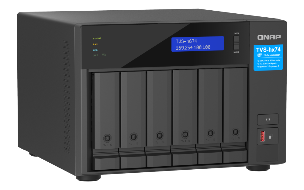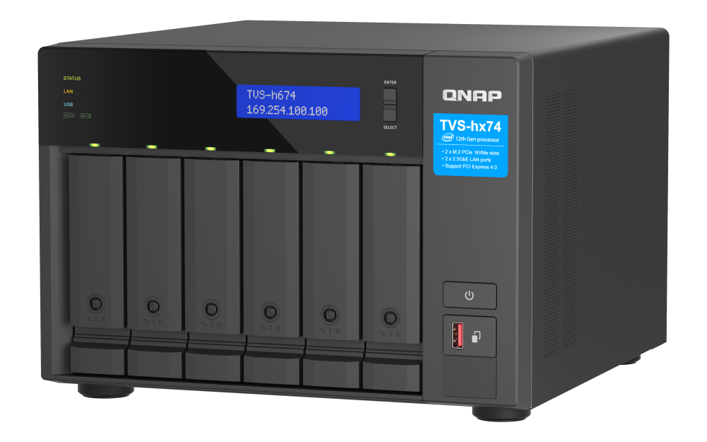Processador Intel i5 de 12ª geração, 32GB RAM, cache SSD M.2, rede 2.5GbE, expansão PCIe Gen 4, sistema QuTS hero e suporte à IA.