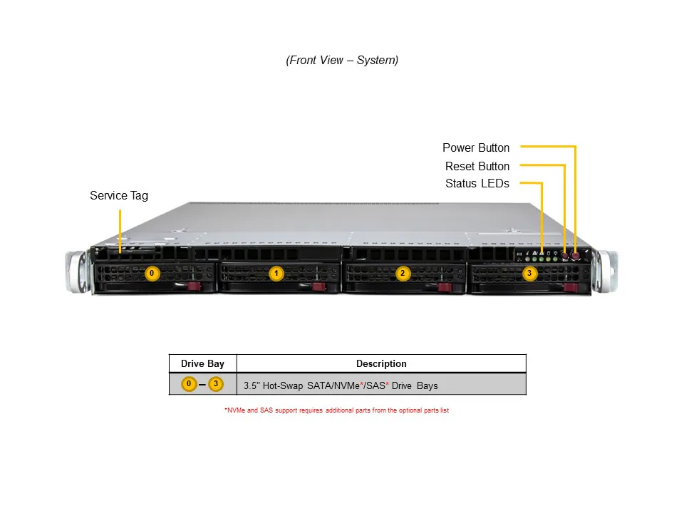 4 baias frontais hot-swap de 3,5” compatíveis com NVMe, SAS ou SATA