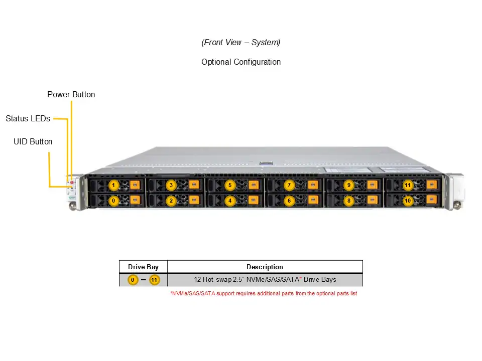 Suporta até 12 baias hot-swap NVMe/SAS/SATA de 2,5″, sendo 8 padrão e 4 opcionais.