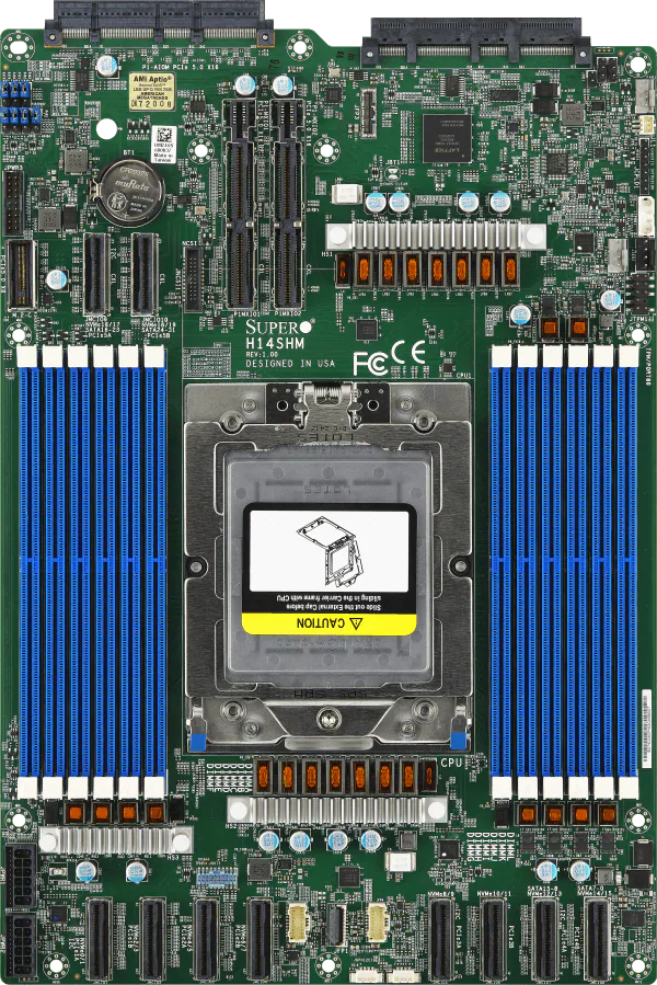 Suporta processadores AMD EPYC das séries 9004 e 9005, com até 192 núcleos e 500W TDP.
