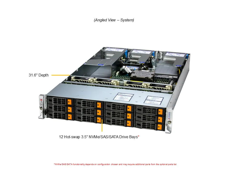 Sim. Possui 12 baias hot-swap compatíveis com discos NVMe, SAS e SATA de 3,5″ ou 2,5″.