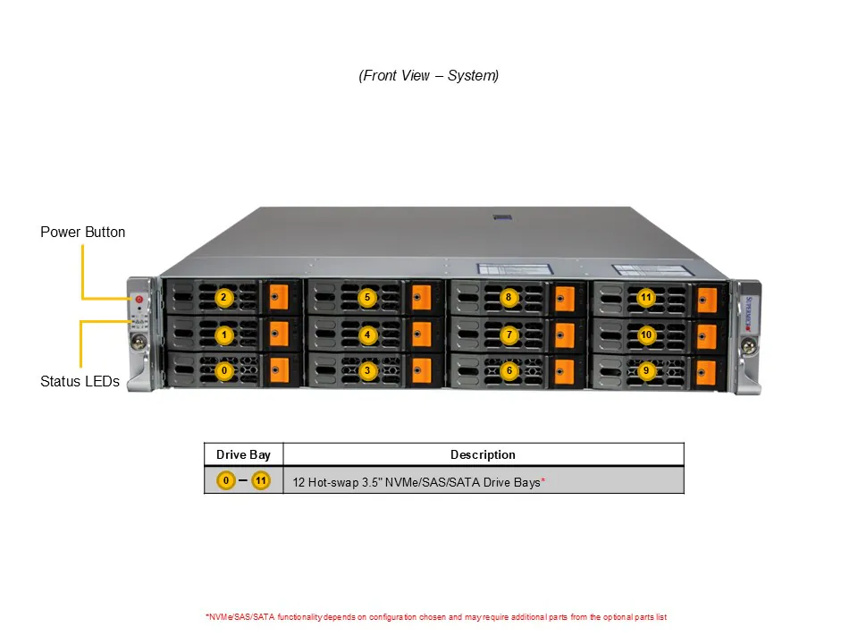 12 baias hot-swap frontais compatíveis com NVMe/SATA/SAS (3,5″/2,5″)