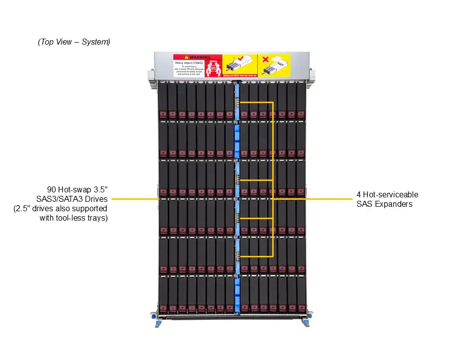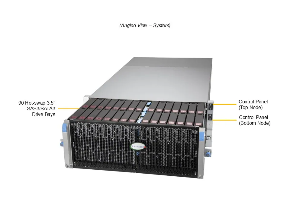 O SSG-542B-DE1CR90 suporta até 90 baias hot-swap SAS/SATA de 3,5″/2,5″ e 2 baias NVMe internas.
