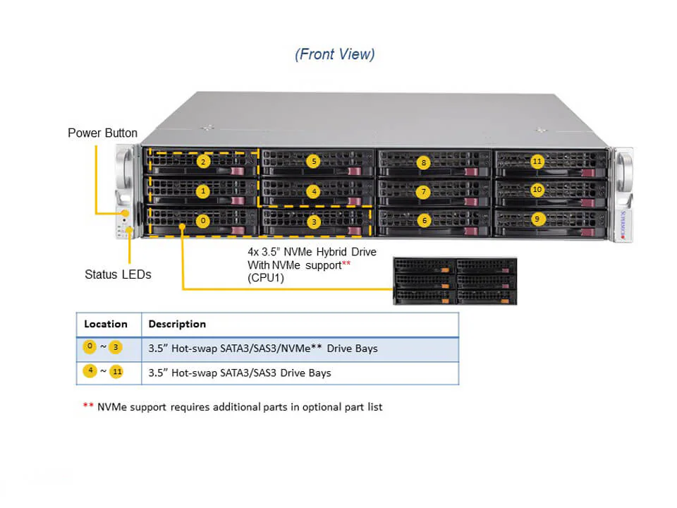 12 baias frontais hot-swap de 3,5″ (8x SAS/SATA + 4x híbridas NVMe/SAS/SATA)