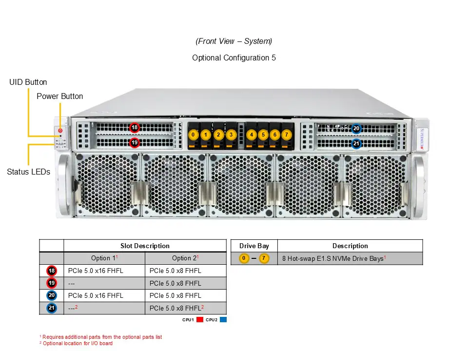 Suporta NVMe E1.S PCIe 5.0 hot-swap (6, 8 ou 14 bays) e NVMe 2.5″ (2, 4 ou 6 bays), além de 2 slots M.2 PCIe 5.0 x2.