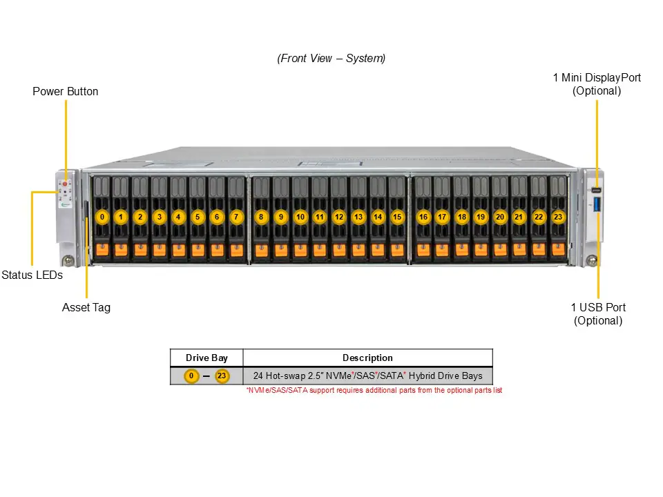 É um servidor 2U de alta densidade com 24 baias NVMe/SATA/SAS hot-swap, ideal para ambientes de nuvem e data center.
