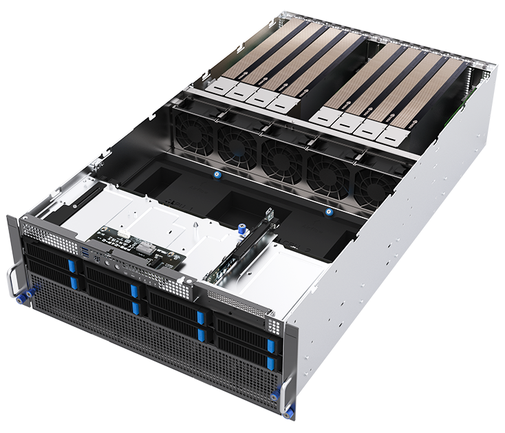 Seu design também acomoda múltiplos cenários de expansão, com combinações flexíveis de armazenamento NVMe/SATA/SAS e opções de controladoras Broadcom MegaRAID ou ASUS PIKE II. Essa modularidade torna o servidor adaptável tanto a clusters de treinamento de IA quanto a sistemas de análise massiva de dados ou render farms.