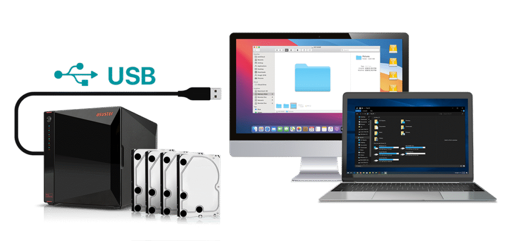 Além de expansão NAS, o AS5004U pode ser conectado diretamente a PCs com Windows, macOS ou Linux, funcionando como uma solução DAS (Direct Attached Storage). Essa flexibilidade atende tanto ambientes corporativos quanto laboratórios de testes e estações de trabalho criativas.