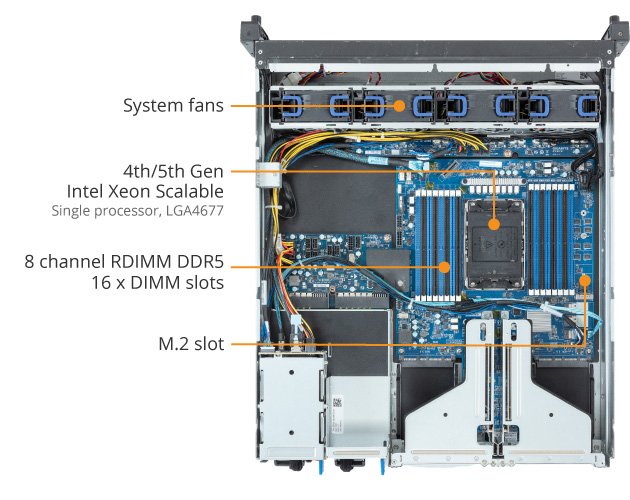 A arquitetura suporta até 64 núcleos, 8 canais de DDR5 RDIMM, duas baias NVMe/SATA/SAS hot-swappable de 2,5” e dois slots PCIe Gen5 x16 para GPUs dual-slot. A plataforma também oferece slots OCP 3.0 para futuras expansões, garantindo interoperabilidade com aceleradores adicionais e adaptação a novas demandas de workloads.