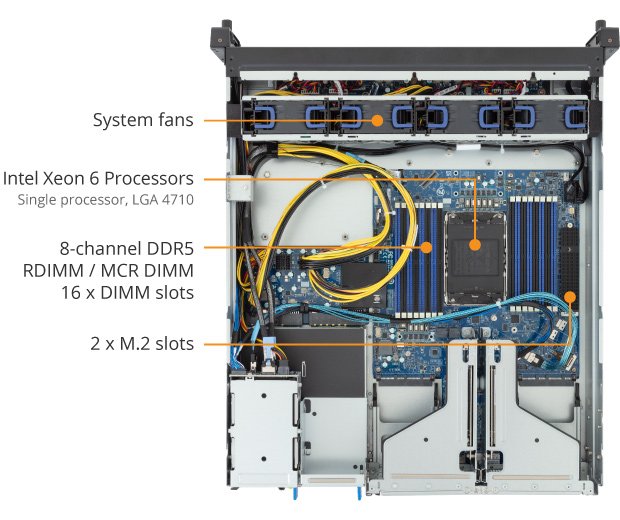 O GIGABYTE E264-S30-AAJ1 representa uma nova geração de servidores edge empresariais, desenhado para atender às demandas mais exigentes de inteligência artificial (IA), análise de dados, computação em nuvem e ambientes de borda. Com base na arquitetura Intel® Xeon® 6, o sistema combina desempenho escalável com eficiência energética, suportando até duas GPUs PCIe Gen5 de alto desempenho e até 16 módulos DDR5 RDIMM/MRDIMM.
