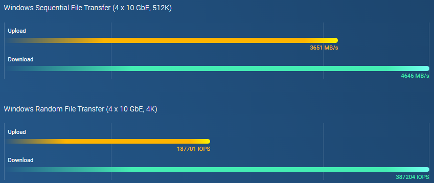Nos testes fornecidos, em um ambiente específico (4 x 10GbE, 512K seq.) foram medidos: upload sequencial 3651 MB/s e download 4646 MB/s. Em 4K random, upload 187701 IOPS e download 387204 IOPS — resultados validados em laboratório da QNAP, variando conforme ambiente.