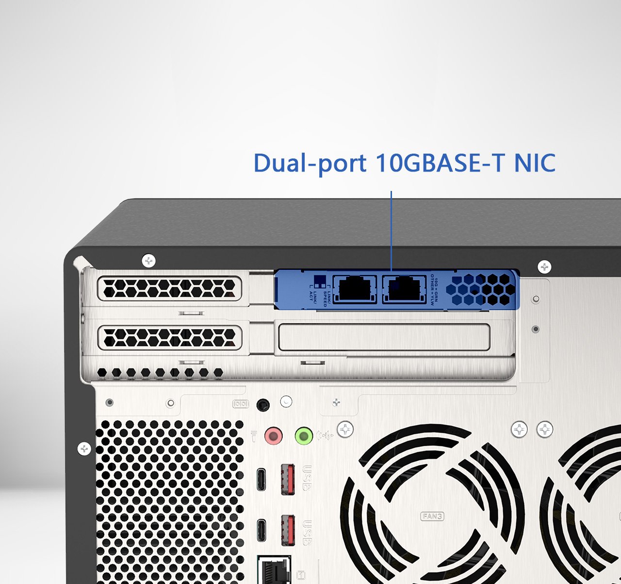 Adicionalmente, o TVS-h1288X traz duas portas 10GBASE-T e quatro portas 2,5GbE integradas, permitindo entroncamento de porta (link aggregation) e failover para alcançar até 20 Gb/s agregada.