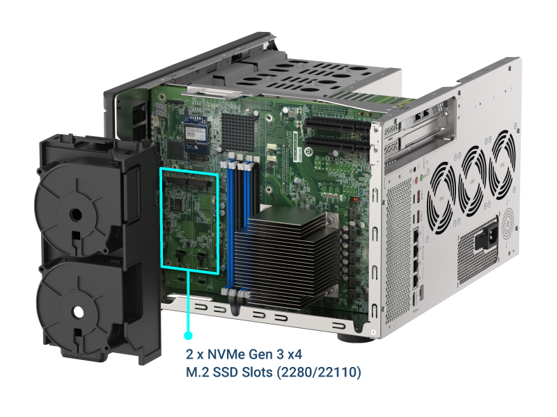 Com dois slots M.2 NVMe e quatro baias de SSD de 2,5″ para cache, o TVS-h1288X permite criar níveis de armazenamento que maximizam IOPS e reduzem latência para bancos de dados e VMs.
