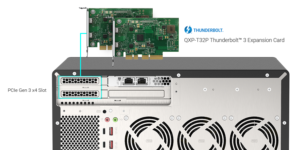 Para edições 4K colaborativas, instalar até duas placas QXP-T32P transforma o NAS em um hub Thunderbolt™ 3 com até quatro portas. Até quatro estações de trabalho Thunderbolt podem conectar-se simultaneamente para acesso de alta velocidade.