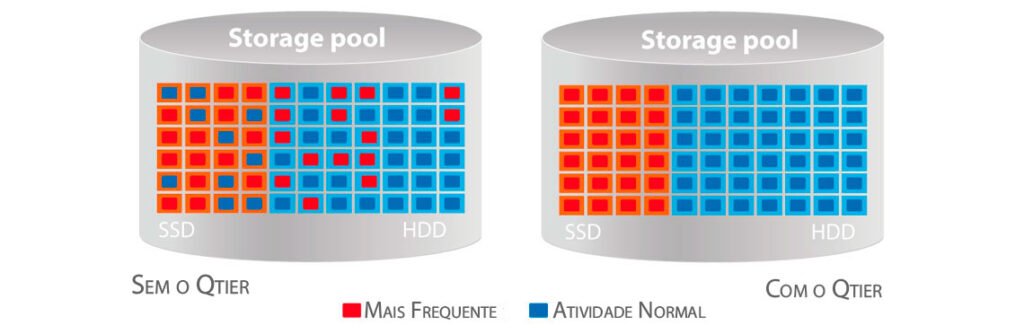 Com suporte a protocolos SMB/CIFS, AFP e NFS, o dispositivo viabiliza colaboração entre plataformas Windows, Mac e Linux/UNIX de forma fluida. A tecnologia Qtier com reconhecimento I/O garante que os dados mais acessados permaneçam em camadas de armazenamento mais rápidas, enquanto volumes de menor prioridade são movidos para HDDs de alta capacidade.
