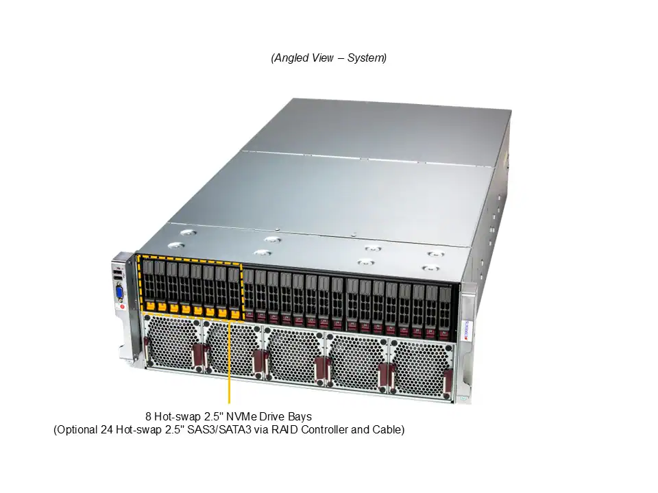 Flexibilidade é um ponto-chave: o servidor oferece múltiplas configurações PCIe 5.0, com até oito slots x16 e opções adicionais via AIOM compatível com OCP NIC 3.0. O armazenamento também é versátil, com oito baias NVMe padrão, expansível até 24 baias SAS/SATA via placa adicional, além de dois slots M.2 NVMe/SATA. Essa arquitetura suporta tanto pipelines de dados de alta velocidade quanto grandes volumes de armazenamento local.