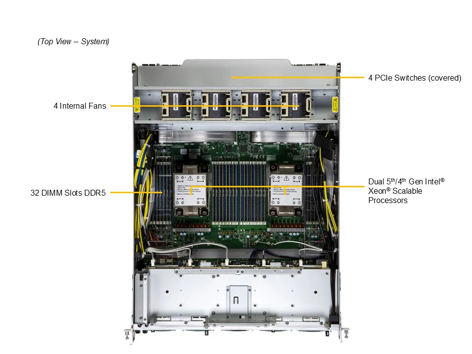 - Duas CPUs Intel Xeon Scalable de 5ª/4ª geração (até 64 núcleos e 320 MB de cache por CPU), conectadas em topologia PCIe 5.0 x16.