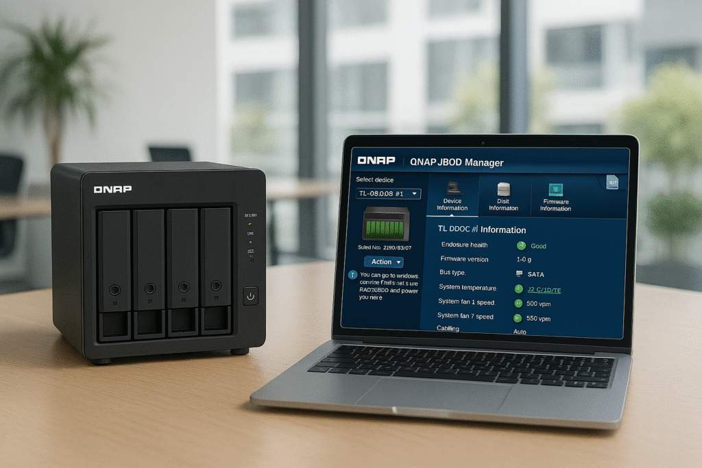 O utilitário Qnap JBOD Manager permite gerenciamento granular com interface amigável, incluindo visualização da saúde dos discos, temperatura, status dos ventiladores e notificações automáticas de falhas. Logs detalhados auxiliam diagnósticos e manutenção preditiva, reduzindo o tempo médio de resposta (MTTR).