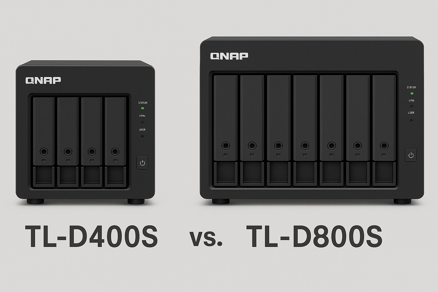 Embora ambos compartilhem recursos como Mini-SAS HD, RAID, hot swap e integração multiplataforma, o TL-D400S oferece solução mais enxuta e acessível frente ao TL-D800S, com metade das baias (4 vs 8) e menor consumo energético.